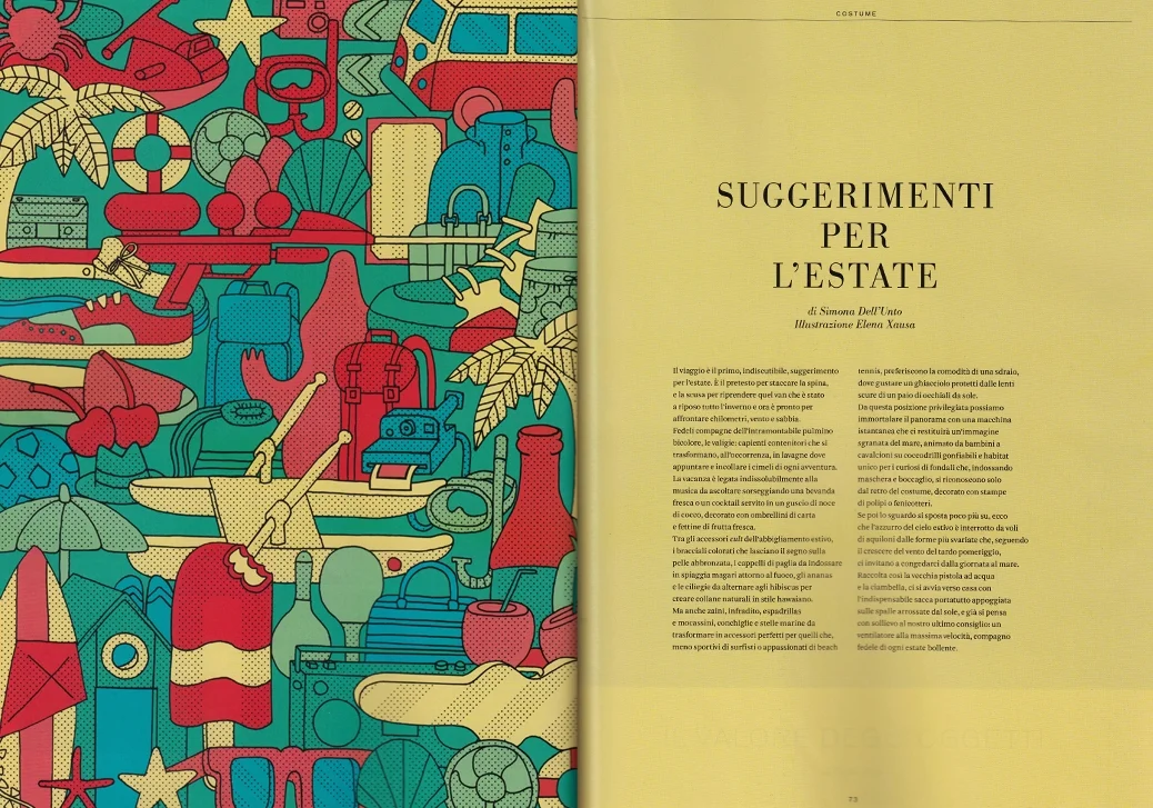 Il viaggio è il primo indiscutibile suggerimento per l'estate. E' il pretesto per staccare la spina, e la scusa per riprendere quel van che è stato a riposo tutto l'inverno e ora è pronto per affrontare chilometri, vento e sabbia. Fedeli compagne dell'intramontabile pulmino bicolore, le valigie: capienti contenitori che si trasformano, all'occorrenza, in lavagne dove appuntare e incollare i cimeli di ogni avventura. La vacanza è legata indissolubilmente alla musica da ascoltare sorseggiando una bevanda fresca o un cocktail servito in un guscio di noce di cocco, decorato con ombrellini di carta e fettine di frutta fresca. Tra gli accessori cult dell'abbigliamento estivo, i bracciali colorati che lasciano il segno sulla pelle abbronzata, i cappelli di paglia da indossare in spiaggia e magari attorno al fuoco, gli ananas e le ciliegie da alternare agli hibiscus per creare collane naturali in stile hawaiano. Ma anche zaini, infradito, espadrillas e mocassini, conchiglie e stelle marine da trasformare in accessori perfetti per quelli che, meno sportivi di surfisti e appassionati di beach tennis, preferiscono la comodità di una sdraio, dove gustare un ghiacciolo protetti dalle lenti scure di un paio di occhiali da sole. Da questa posizione privilegiata possiamo immortalare il panorama con una macchina istantanea che ci restituirà l'immagine sgranata del mare, animato da bambini a cavalcioni su coccodrilli gonfiabili e habitat unico per i curiosi di fondali che, indossando maschera e boccaglio, si riconoscono solo dal retro del costume, decorato con stampe di polpi e fenicotteri. Se poi lo sguardo si sposta poco più su, ecco che l'azzurro del cielo estivo è interrotto da voli di acquiloni dalle forme più svariate che, seguendo il crescere del vento del tardo pomeriggio, ci invitano a congedarci dalla giornata al mare. Raccolta così la vecchia pistola ad acqua e la ciambella, ci si avvia verso casa con l'indispensabile sacca porta-tutto appoggiata sulle spalle arrossate dal sole e già si pensa con sollievo all'ultimo consiglio: un ventilatore alla massima velocità, compagno fedele di ogni estate bollente.