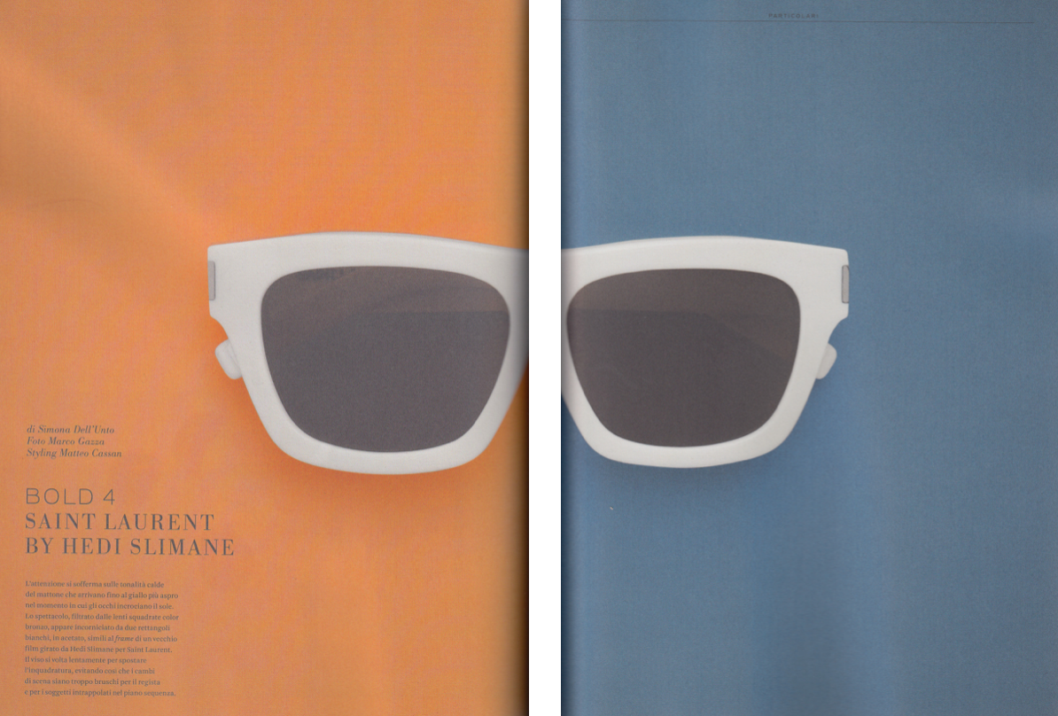 L'attenzione si sofferma sulle tonalità calde del mattone che arrivano fino al giallo più aspro nel momento in cui gli occhi incrociano il sole. Lo spettacolo, filtrato dalle lenti squadrate color bronzo, appare incorniciato da due rettangoli bianchi, in acetato, simili al frame di un vecchio film girato da Heidi Slimane per Saint Laurent. Il viso si volta lentamente per spostare l'inquadratura, evitando così che i cambi di scena siano troppo bruschi per il regista e per i soggetti intrappolati nel piano sequenza.