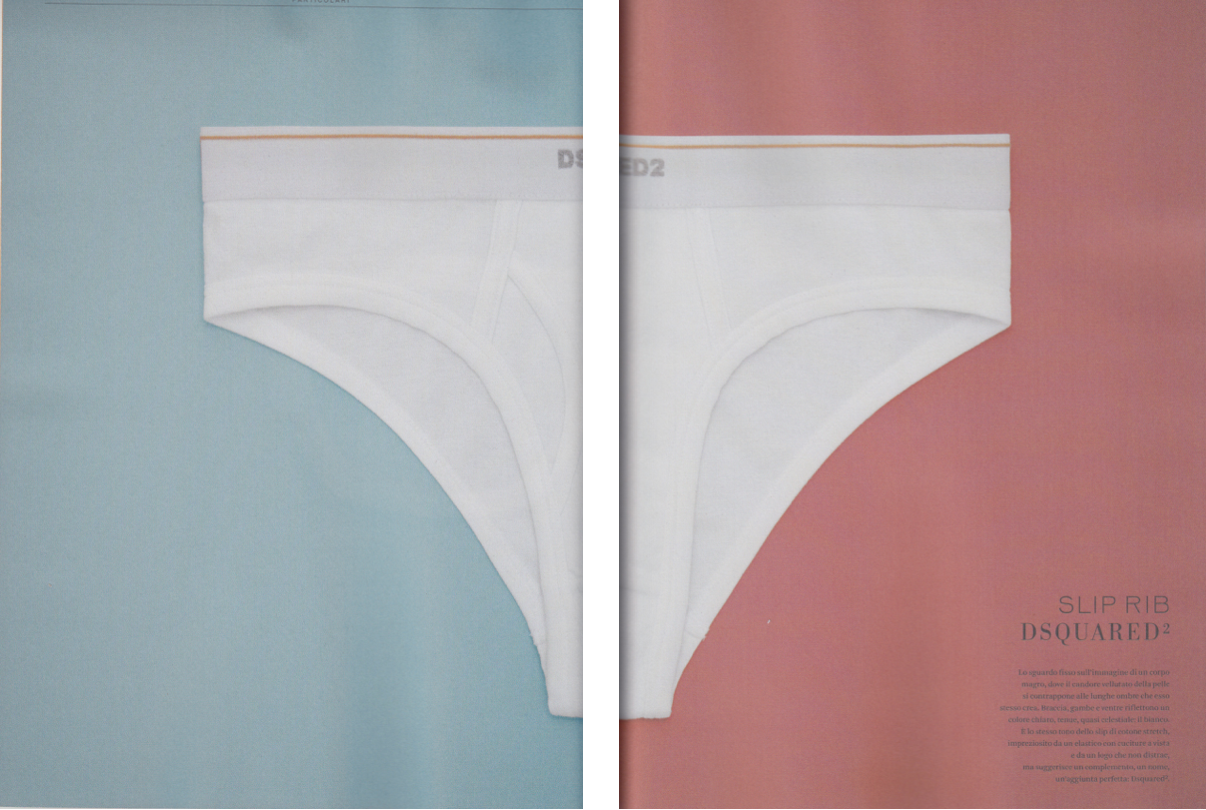 Lo sguardo fisso sull'immagine di un corpo magro, dove il candore vellutato della pelle si contrappone alle lunghe ombre che esso stesso crea. Braccia, gambe e ventre riflettono un colore chiaro, tenue, quasi celestiale: il bianco. E' lo stesso tono dello slip di cotone stretch, impreziosito da un elastico con cuciture a vista e da un logo che non distrae, ma suggerisce un complemento, un nome, un'aggiunta perfetta: Dsquared2.