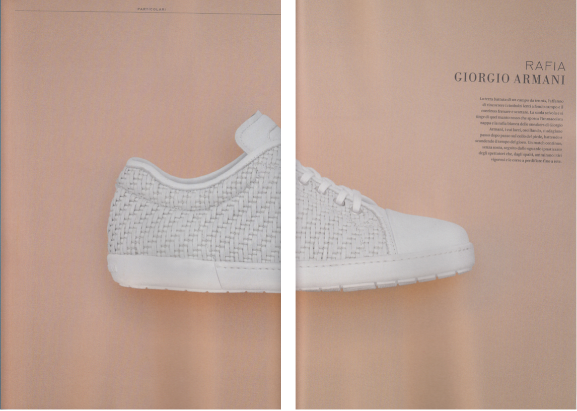 La terra battuta di un campo da tennis, l'affanno di rincorrere i rimbalzi lenti a fondo campo e il continuo frenare e scattare. La suola scivola e si tinge di quel manto rosso che sporca l'immacolata nappa e la rafia bianca delle sneakers di Giorgio Armani, i cui lacci, oscillano, si adagiano passo dopo passo sul collo del piede, battendo e scandendo il tempo del gioco. Un match continuo, senza sosta, seguito dallo sguardo ipnotizzato degli spettatori che, dagli spalti, ammirano i tiri vigorosi e le corse a perdifiato fino a rete.