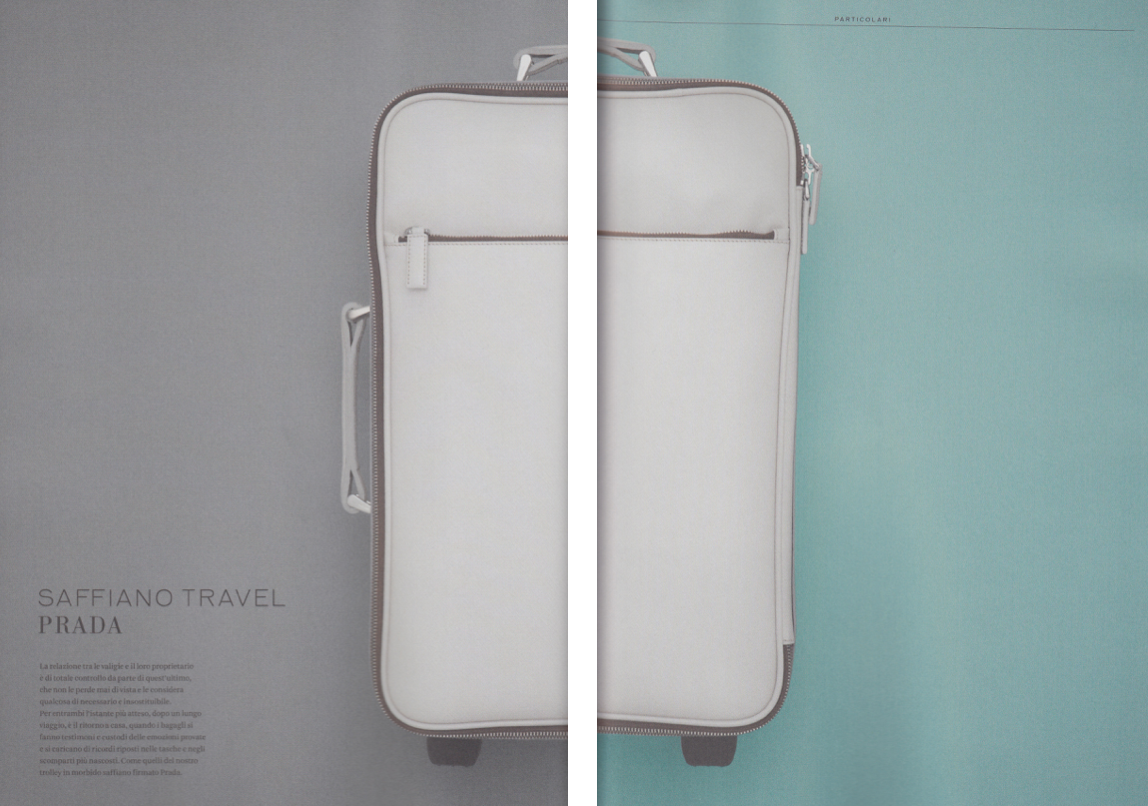 La relazione tra le valigie e il proprio proprietario è di totale controllo da parte di quest'ultimo che non la perde mai di vista e la considera qualcosa di necessario e insostituibile. Per entrambi l'istante più atteso, dopo un lungo viaggio, è il ritorno a casa, quando i bagagli si fanno testimoni e custodi delle emozioni provate e si caricano di ricordi riposti nelle tasche e negli scomparti più nascosti. Come quelli del nostro trolley in morbido soffiano firmato Prada.