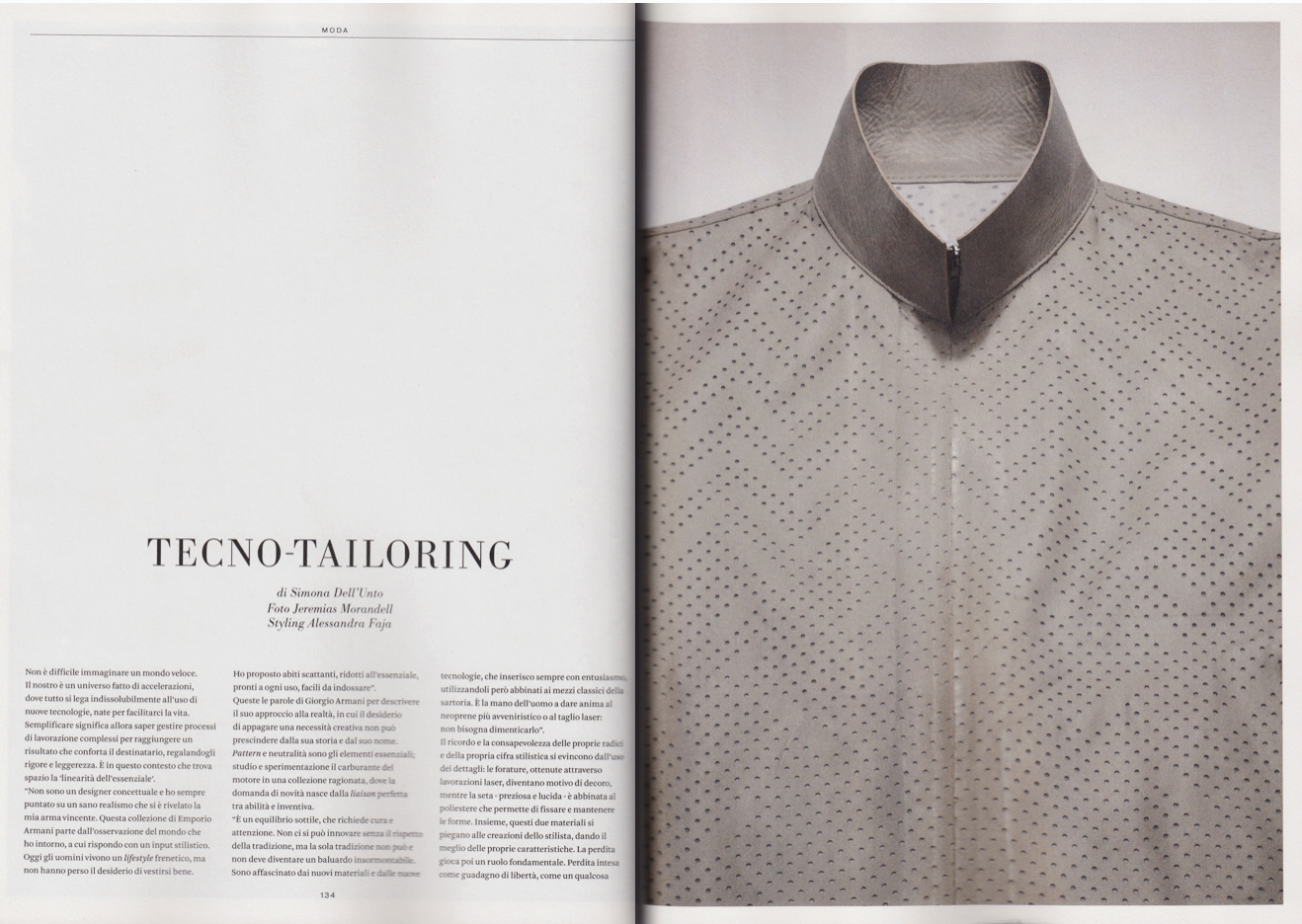 Il ricordo e la consapevolezza delle proprie radici e della propria cifra stilistica si evincono dall'uso dei dettagli: le forature, ottenute attraverso lavorazioni laser, diventano motivo di decoro, mentre la seta - preziosa e lucida - è abbinata al poliestere che permette di fissare e mantenere le forme. Insieme, questi due materiali si piegano alle creazioni dello stilista, dando il meglio delle proprie caratteristiche. La perdita gioca poi un ruolo fondamentale. Perdita intesa come guadagno di libertà, come qualcosa di superfluo che viene depennato dalle nostre abitudini, a volte troppo conservatrici e rigide. Armani propone allora capi privi di fodere, con zip a scomparsa, prediligendo giochi di forme e costruzioni che, con motivi concentrici e ipnotici, si perdono su una superficie delle tonalità neutre. Uno stile nuovo riassumibile nel tecno - tailoring, che arricchisce e riduce gli abiti all'essenza. Una linearità pratica, modellata sulle esigenze di uomini alla ricerca del nuovo, che Armani ottiene sviluppando innovative tecniche di lavorazione.