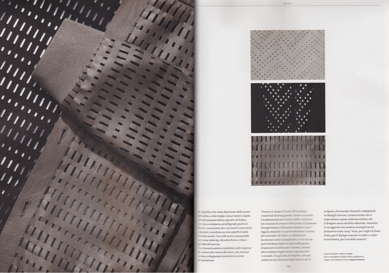 Oggi la creatività si esprime attraverso l'analisi dei materiali e dei filati. Lo dimostrano lavorazioni come la doppiatura, in cui alcune parti del blazer Made in Italy raddoppiano di spessore stratificando il tessuto, mentre altre risultano leggerissime, ergonomiche e versatili. Con gli abiti di Emporio, Armani celebra la vita dinamica degli uomini che lo scelgono, eliminando i fronzoli e indugiando su dettagli ricercati. Caratteristiche che si rispecchiano a pieno nella descrizione che il designer stesso dà alla collezione, riassunta in tre aggettivi che rendono al meglio la sua primavera - estate 2014: "Pura, per i tagli e le linee. Fisica, per il dialogo costante tra abito e corpo. Avveniristica, per l'uso delle materie".