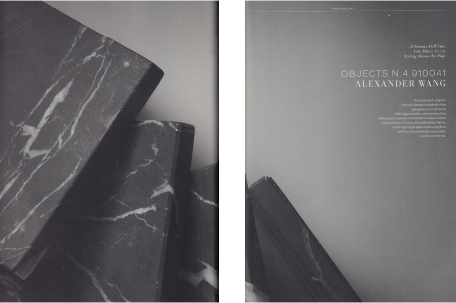 Il vino scendeva corposo. Un rosso intenso riempiva il calice appoggiato su un elemento dalla foggia insolita, unico protagonista della scena: un piccolo sottobicchiere in marmo nero venato di bianco, firmato Alexander Wang Objects. Liscio sugli angoli della sagoma spigolosa, soffice al tocco nella fase sottostante, in pelle scamosciata.
