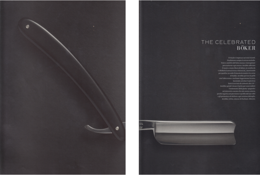Il rituale è impresso nei miei ricordi. Fischiettava sempre la stessa melodia. Potevo sentirlo dall'altra parte della stanza e immaginare precisamente ogni mossa. Avrebbe afferrato il rasoio a mano libera di Böker, in vendita da Coltelleria Lorenzi, ammirando per qualche secondo il massiccio manico in corno di bufalo. Avrebbe poi teso la pelle con l'altra mano e inclinato leggermente la testa, lasciando scivolare la preziosa lama in acciaio di carbone alta 7/8 ". Avrebbe quindi roteato il polso per assecondare l'andamento della punta spagnola: un'estremità concava che mio nonno ama, perché seguiva con precisione il profilo del suo volto e gli permetteva di definire ogni minimo dettaglio. Avrebbe, infine, smesso di fischiare. Silenzio.