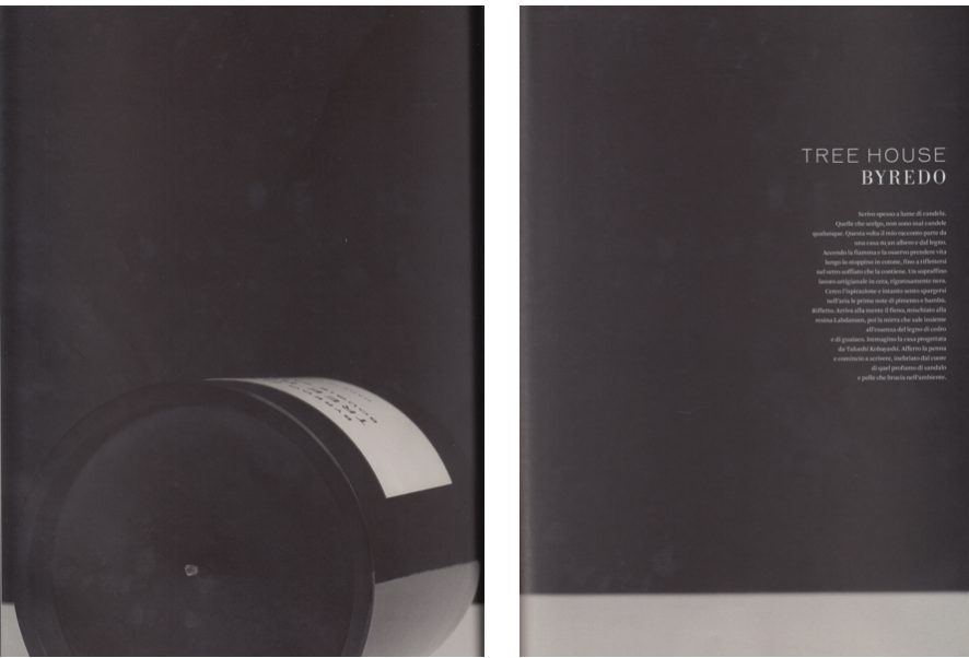Scrivo spesso a lume di candela. Quelle che scelgo, non sono mai candele qualunque. Questa volta il mio racconto parte da una casa su un albero e dal legno. Accendo la fiamma e la osservo prendere vita lungo lo stoppino in cotone, fino a riflettersi nel vetro soffiato che la contiene. Un sopraffino lavoro artigianale in cera, rigorosamente nera. Cerco l'ispirazione e intanto sento spargersi nell'aria le prime note di pimento e bambù. Rifletto. Arriva alla mente il fieno, mischiato alla resina Labdanum, poi la mirra che sale insieme all'essenza del legno di cedro e di guaiaco. Immagino la casa progettata da Takashi Kobayashi. Afferro la penna e comincio a scrivere, inebriato dal cuore di quel profumo di sandalo e pelle che brucia nell'ambiente.